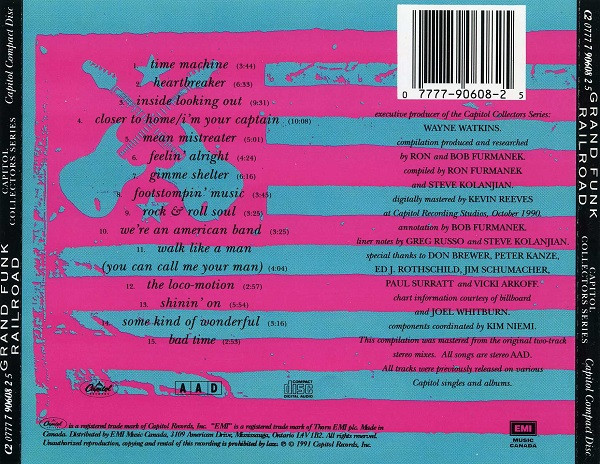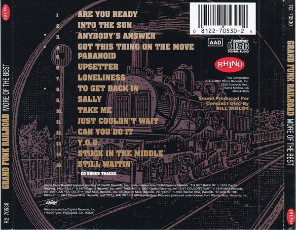Anyway, following the Christmas of (either) 1991 or 92, I headed over to Sam’s and selected 2 Grand Funk compilations, both of which were issued in ’91, and retailed for about $18.99 back then – Collector’s Series (on Capitol) and More Of The Best (on Rhino). I don’t how close these 2 were coordinated and released, but they were/are the perfect pair of GFR compilations 16 hits on one, and 15 on the other, with no repeated tracks. While the Collector’s Series includes all the band’s biggest singles from 1969’s “Time Machine” and ending with 1975’s lighter “Bad Time”, More Of The Best includes the early live favorites like “Are You Ready”, “Into The Sun’: and “Loneliness” , as well as later lesser hits, like “To Get Back In”, “Sally”, and a few from the band’s early ’80s comeback albums. So, these 2 really cover something from the band’s entire career.