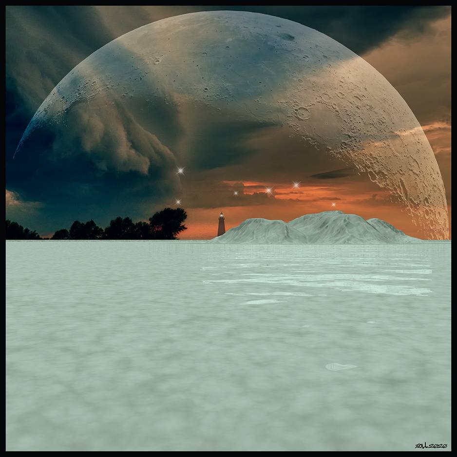 Creating the cover… The back is a 3D model I made of an ice plane with small eroded mountains. The sky was a photo I took of a storm rolling into the Oswego Harbor in NY. I superimposed a shot of the Super moon I took, and topped it off with a lighthouse on the horizon getting its beacon light from the “Phecda” star of Ursa Major in the sky.
