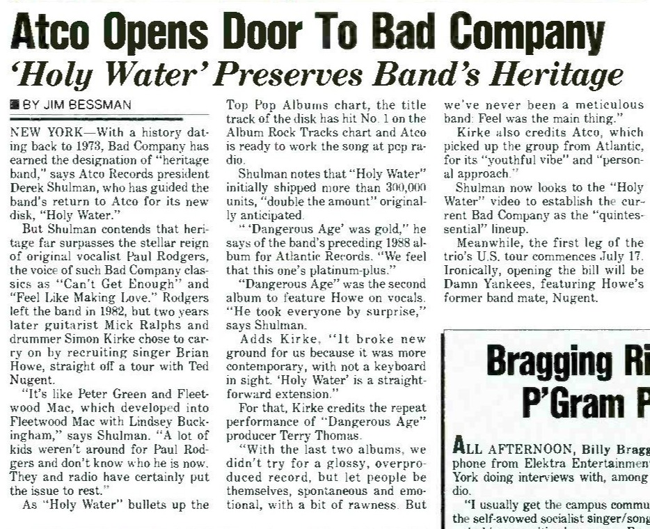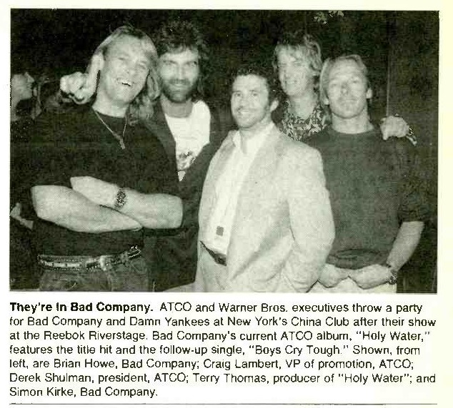 BAD COMPANY If You Need Somebody (4:21) PRODUCER: Terry Thomas WRITERS: Howe, Thomas PUBLISHERS: Warner Chappell /TJT Songs /Phantom /WB, ASCAP Atco 4 -98914 (c /o Atlantic) (cassette single) – Sensitive rock ballad is given depth and dimension by singer Brian Howe’s heartfelt performance. One of many fine tracks on the band’s current “Holy Water” set. (Billboard, 10/90)